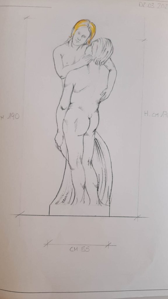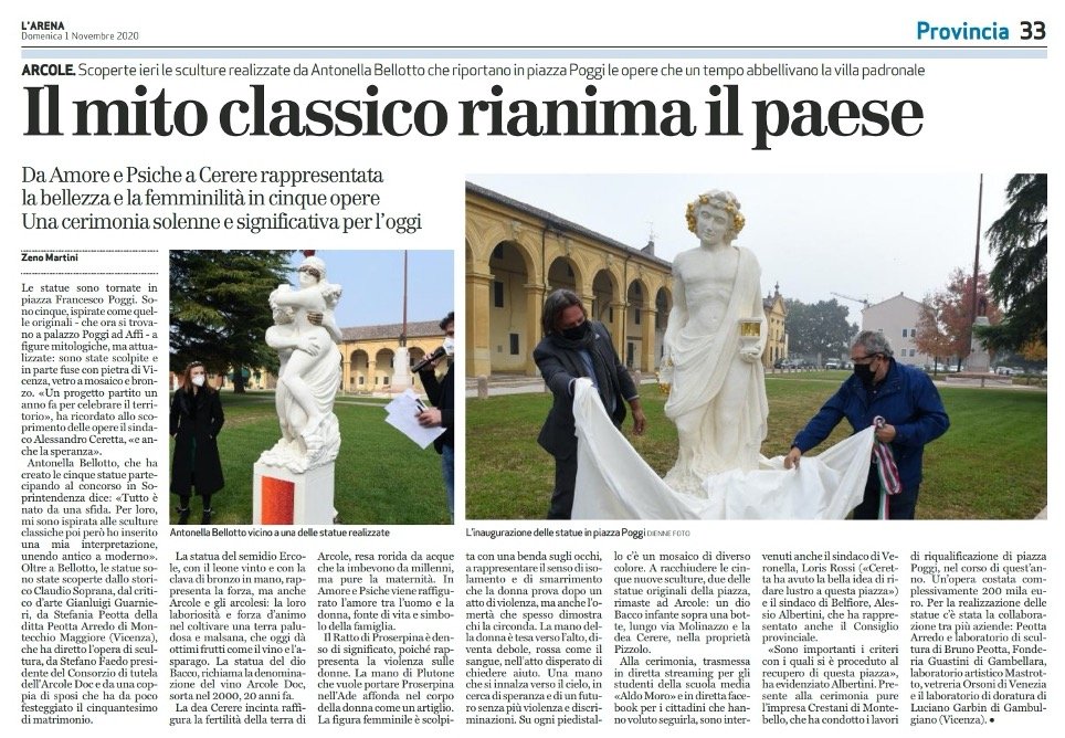 Questo progetto muove i primi passi ad ottobre del 2018, quando ci contatta Antonella Bellotto, docente vicentina  di arte. Ci chiede aiuto per realizzare cinque sculture allegoriche per la Piazza Poggi nel comune di Arcole (Verona) secondo un suo progetto. La richiesta iniziale arriva dal Comune che vuole sostituire le cinque sculture originali della piazza, che sono rientrate in una villa, con altre cinque statue simili ispirate ad Ercole, il ratto di Proserpina, Amore e Psiche, Bacco e una figura femminile.
