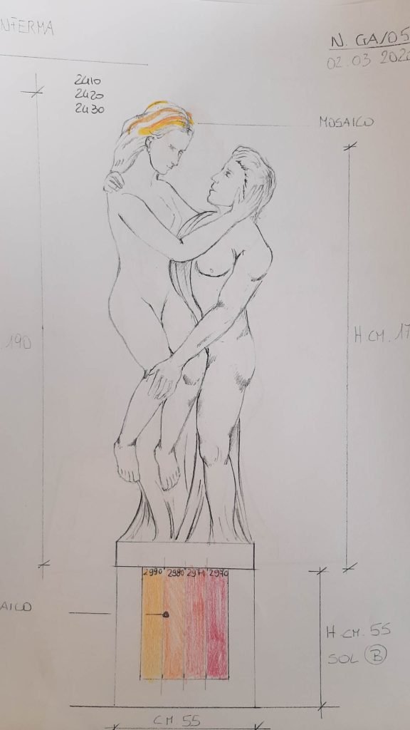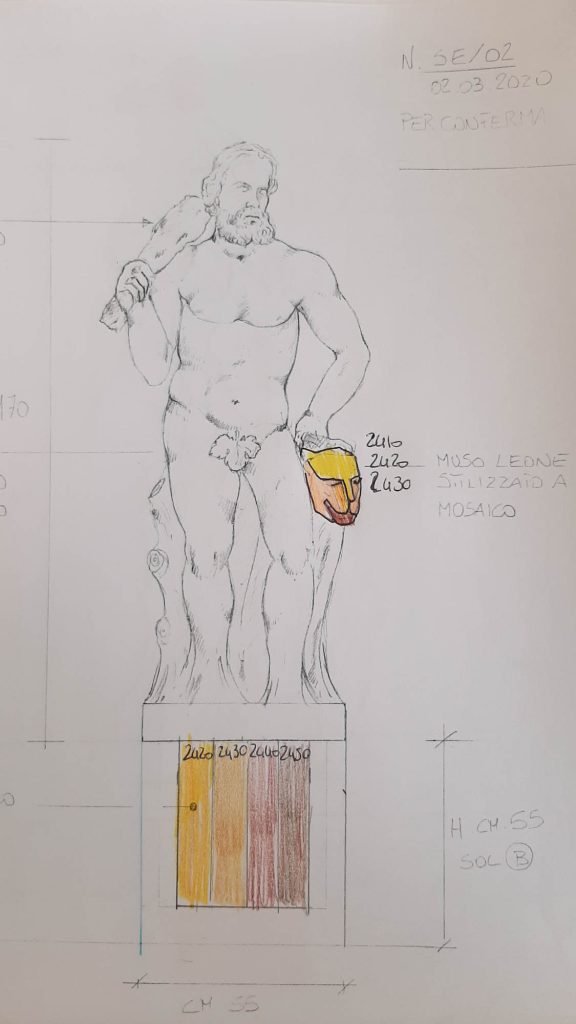 Per Ercole il mosaico è sulla testa del leone ucciso, quasi a ricordare una maschera africana. Nella maternità il mosaico di tonalità azzurre è stato inserito tra le pieghe della veste, all’altezza della pancia, per evidenziare il grembo materno in attesa del figlio. Nella statua di Bacco un mosaico dorato ha rivestito la coppa del vino per enfatizzare uno dei prodotti d’eccellenza del comune di Arcole. Nel ratto della violenza invece si è rivestito la mano che passa da un rosso scuro a un rosa carne naturale, per indicare che chiedendo aiuto tendendo una mano si può uscire dalla situazione di violenza subita. Sull‘Amore il mosaico è andato a impreziosire i capelli della donna.
