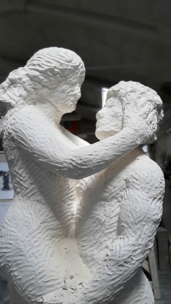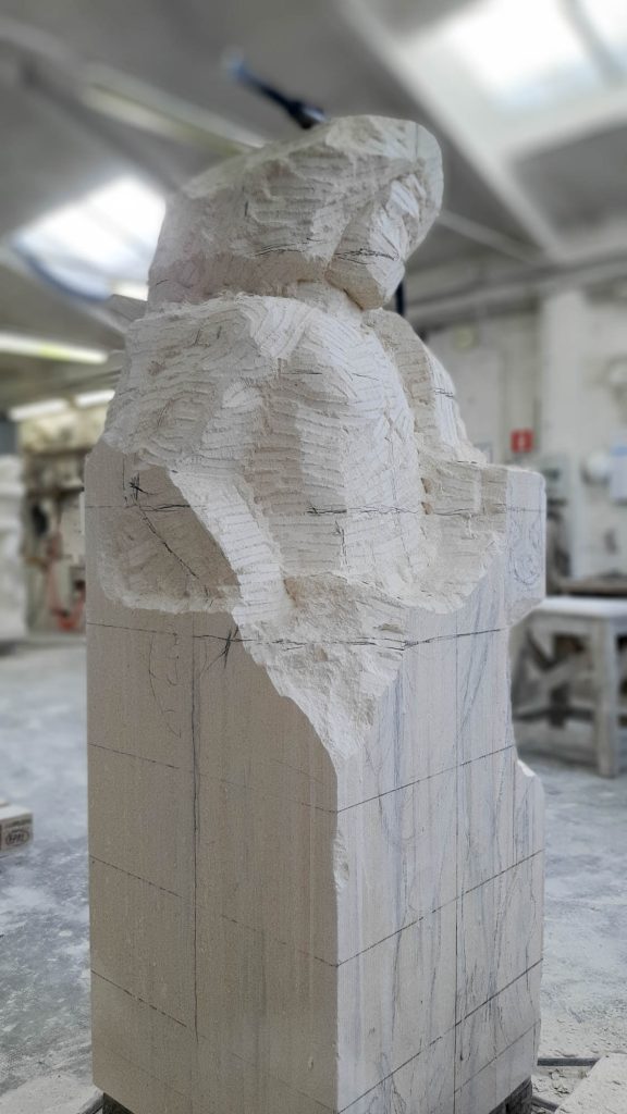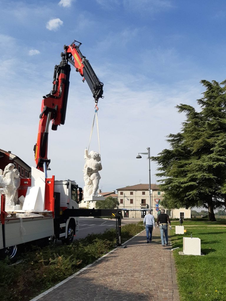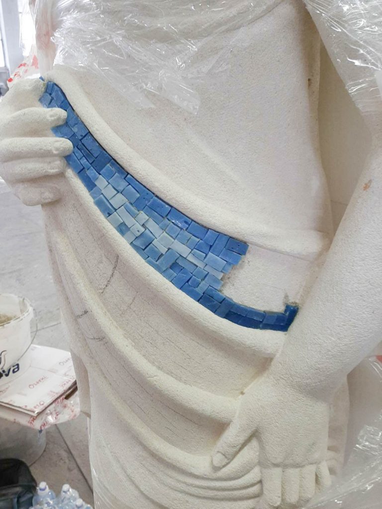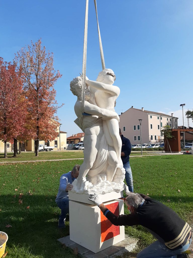 Un lavoro complesso, soprattutto nell’individuare materiali e aziende artigiane per la collaborazione. Fortunatamente viviamo in un territorio ricco di artigiani con grandi capacità e di materia prima di alta qualità . Ad inizio febbraio arriva il via libera del comune all’inizio dei lavori, ma nessuno può prevedere l’arrivo del COVID 19. Un imprevisto non da poco, che non ci ha impedito di inaugurare a fine ottobre, con un solo mese di ritardo. All’inaugurazione ufficiale ha partecipato tutto il paese: storici del comune, critici d’arte e della cittadinanza. Le statue appena posate sono state coperte da un telo, per essere svelate solo all’ultimo. Le sculture da realizzare in Pietra di Vicenza sono state arricchite di significati attuali e con applicazioni di elementi in altri materiali nobili il bronzo, il mosaico vetroso artistico e la foglia d’oro per dare un effetto contemporaneo.