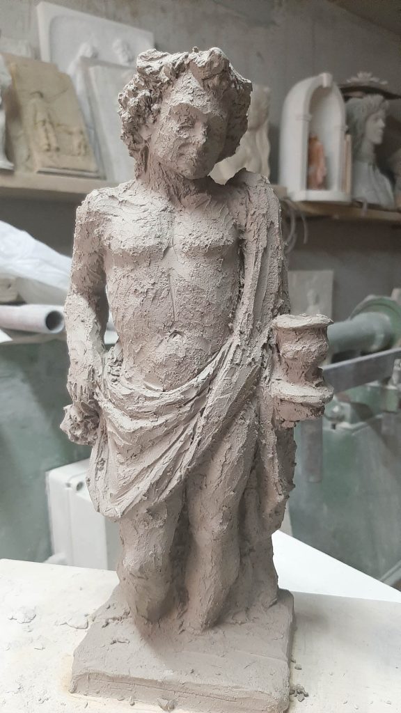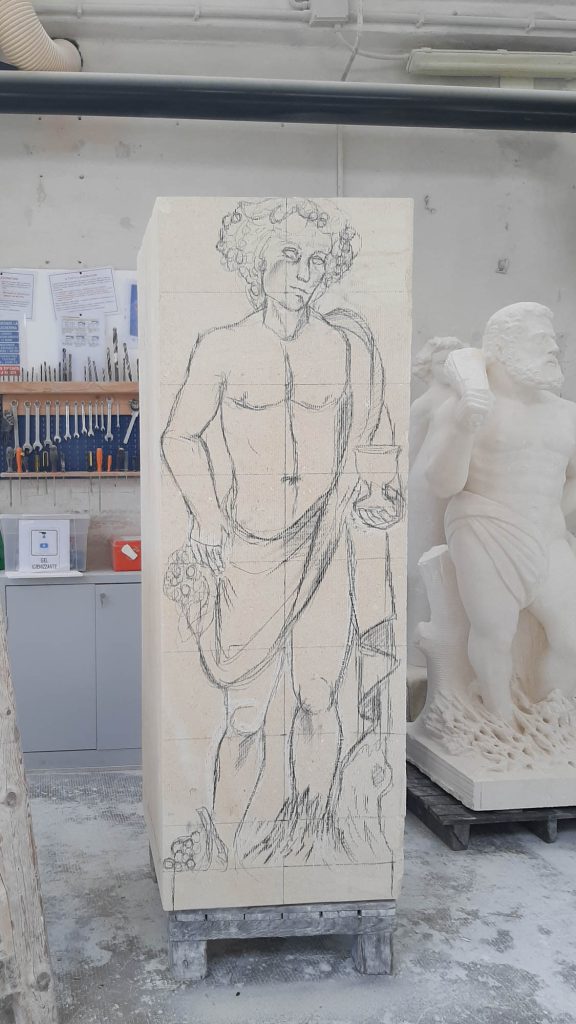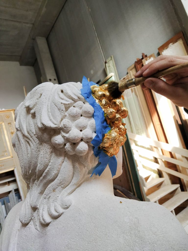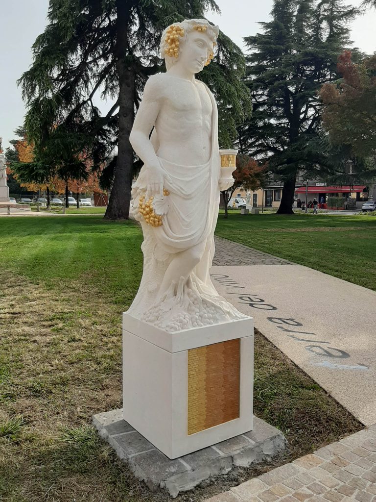 La foglia d’oro: Solo sul Bacco abbiamo fatto applicare dei dettagli oro con la tecnica della doratura a missione: su alcuni grappoli d’uva che tiene in mano in onore del vino Garganega, tipico della zona.