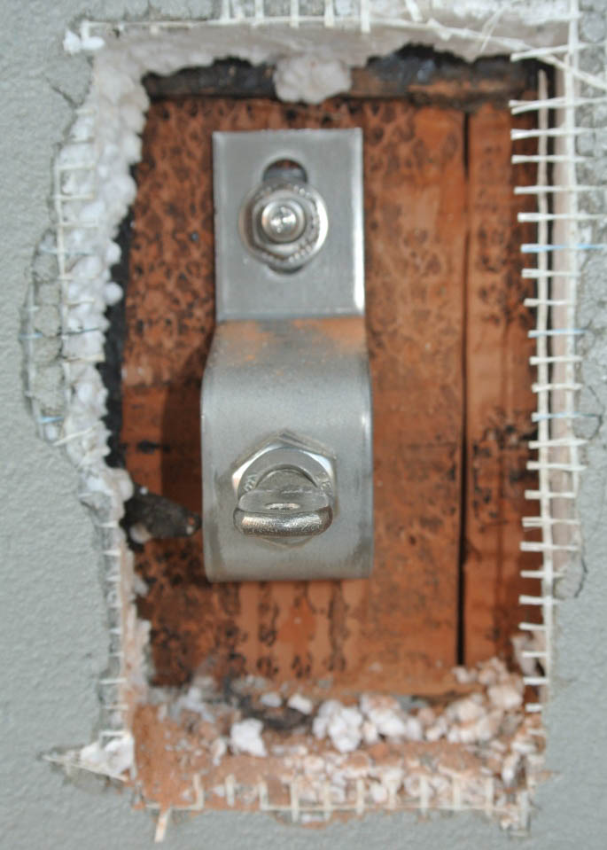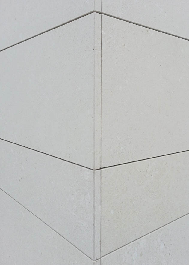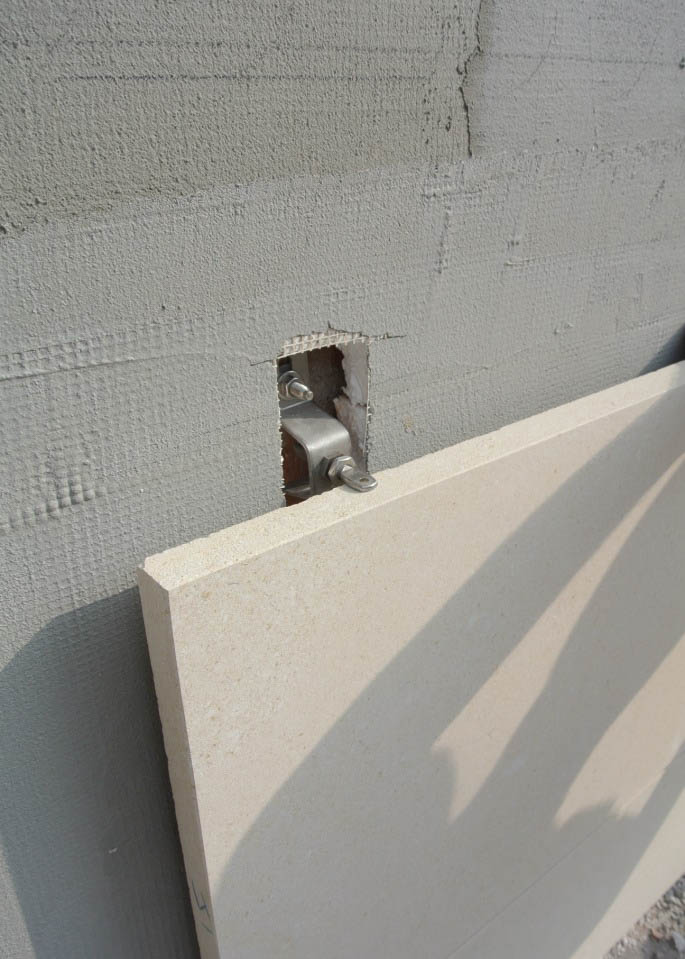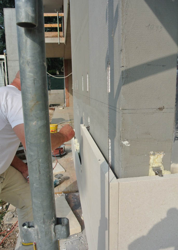 Per ancorare la struttura alla parete abbiamo scelto un sistema di ancoraggio Halfen e la Pietra di spessore 3 cm è stata trattata in laboratorio con il nostro idrorepellente traspirante PA903. La scelta dello spessore del rivestimento era dalla necessità di contenere nello spessore dei tagli – detti kerf – da 1 cm circa per inserire gli ancoraggi. Il taglio è stato eseguito su tutta la lunghezza orizzontale della lastra perché non si poteva prevedere dove inserire nel muro la staffa.